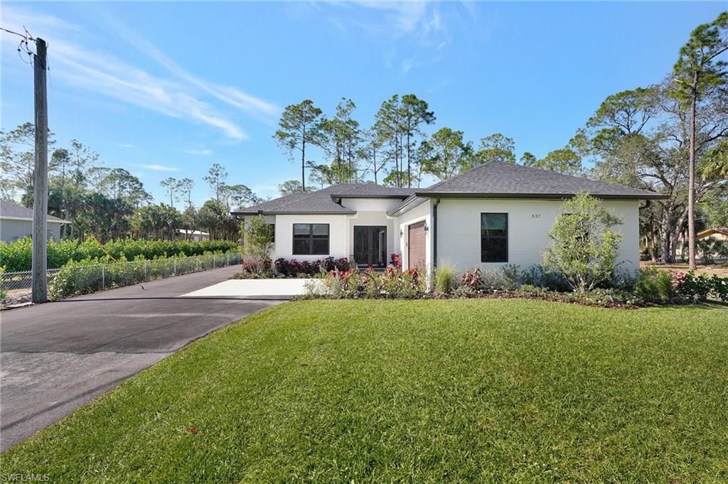 Welcome to your dream home in the sought-after Golden Gate Estates area, west of Wilson Blvd! This stunning new construction is set on a 1.14-acre rare 100% upland lot and offers 3 bedrooms, a versatile den, 2 bathrooms, and a 2-car garage. The home spans 1,656 sq. ft. of living space with a grand total of 2,398 sq. ft. Carefully selected upgrades include elegant wood plank porcelain tile flooring, sophisticated crown molding, and gorgeous quartz countertops. The kitchen is a chef's delight, featuring Refrigerator and appliances with customize door panels in white glass, solid wood cabinets, and two pantries for ample storage. The spacious living room and master suite feature elegant tray ceilings, adding a touch of luxury. The master suite offers an oversized bedroom, a large closet, a double vanity, and a glass-enclosed shower. The exterior is just as impressive, with a beautifully designed landscape, a paved driveway, an automatic sprinkler system, and a summer kitchen ideal for hosting gatherings. Enjoy peaceful mornings and relaxing evenings on the expansive lanai. With impact-resistant windows and doors, this home blends safety with style. Don